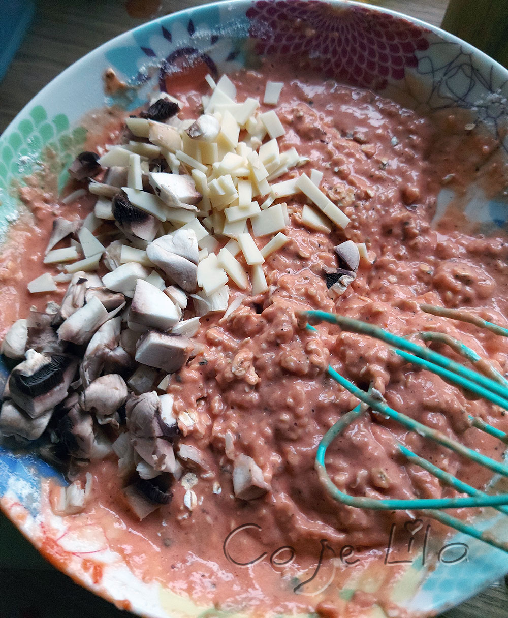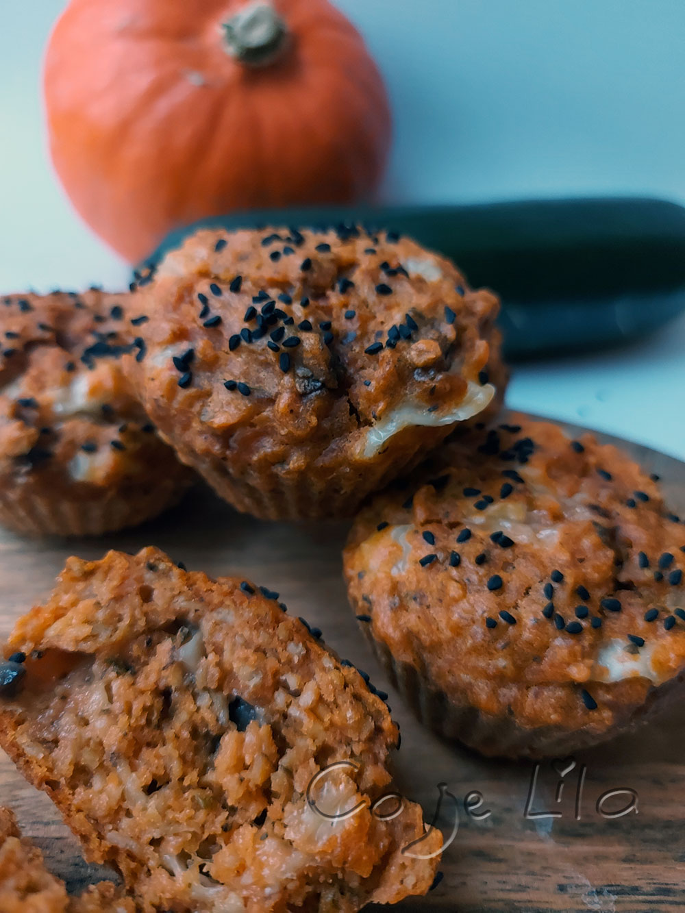 Pomidory, czosnek, jajko i olej blendujemy. Dodajemy mąki, przyprawy, na koniec drobno pokrojone warzywa i mieszamy. Masa wychodzi dość gęsta. Nakładamy do foremek posypując czarnuszką, sezamem lub słonecznikiem. Pieczemy w 180 stopniach 27-30 minut. Z przepisu wyszło 6 sztuk.