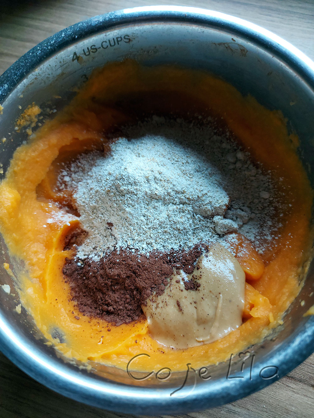 Batata i jabłko obieramy, kroimy na mniejsze kawałki i gotujemy do miękkości ok 20 min. Odcedzamy, blendujemy z pozostałymi składnikami. Układamy na papierze do pieczenia, albo robimy w  foremce na muffinki (nie pomyślałam o tym 😊). Mokrą łyżką możesz nadać kształt. Pieczemy w 180 stopniach z opcją góra-dół przez 15 min. Ciasteczka smakują po schłodzeniu.
