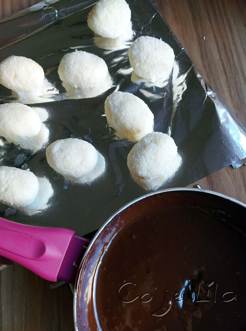 Kładę na łyżkę batonika i oblewam łyżeczka z wszystkich stron. Odkładam na talerzyk. Możemy posypać wiórkami na górze. Najlepiej smakują następnego dnia. Przechowuj przykryte folią.