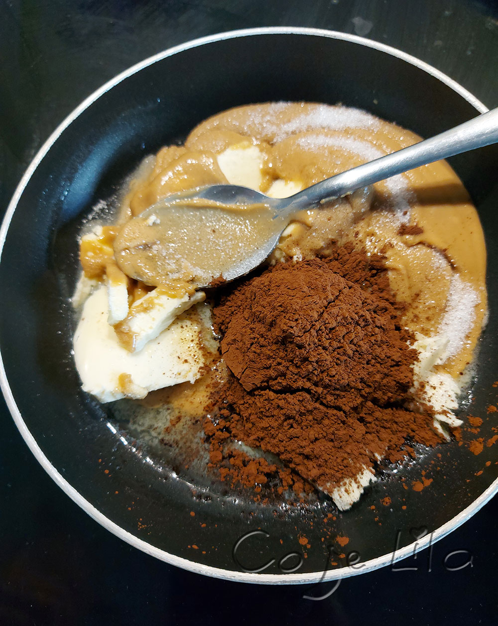 Wszystkie składniki umieszczamy na patelni/w garnku i na małym ogniu rozpuszczamy. Mieszamy aż zrobi się gładka masa. Przelewamy w foremki i chłodzimy. Po 4h już można je wyjmować, ale lepiej żeby dłużej się schłodziły.