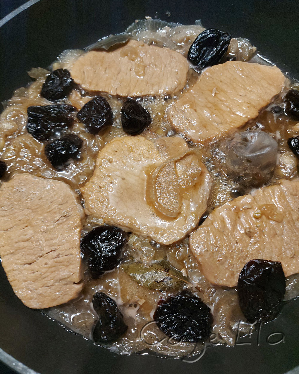 Na rozgrzany olej wrzucamy schab i smażymy z każdej strony, dorzucamy cebulkę i jeszcze chwilę smażymy. Zalewamy ciepłą wodą, dodajemy kilka listków laurowych, kilka ziarenek ziela angielskiego, piramidkę smaku i zalewamy całość wodą. Dusimy pod przykryciem ok 2h. Jeżeli widelec delikatnie wchodzi w mięso dorzucamy śliwki i dusimy jeszcze 30 minut. W trakcie możesz dolać wody jeśli wyparowała większość. Pod koniec oprószamy delikatnie całość mąką ziemniaczaną delikatnie mieszając. Porcja dla taty, mamy i dziecka. Podałam z ziemniakami, ogórkiem kiszonym oraz surówką z białej rzodkwi, jabłka, jogurtu greckiego, soku z cytryny, pieprzu. Idealnie to wszystko do siebie pasowało 😛