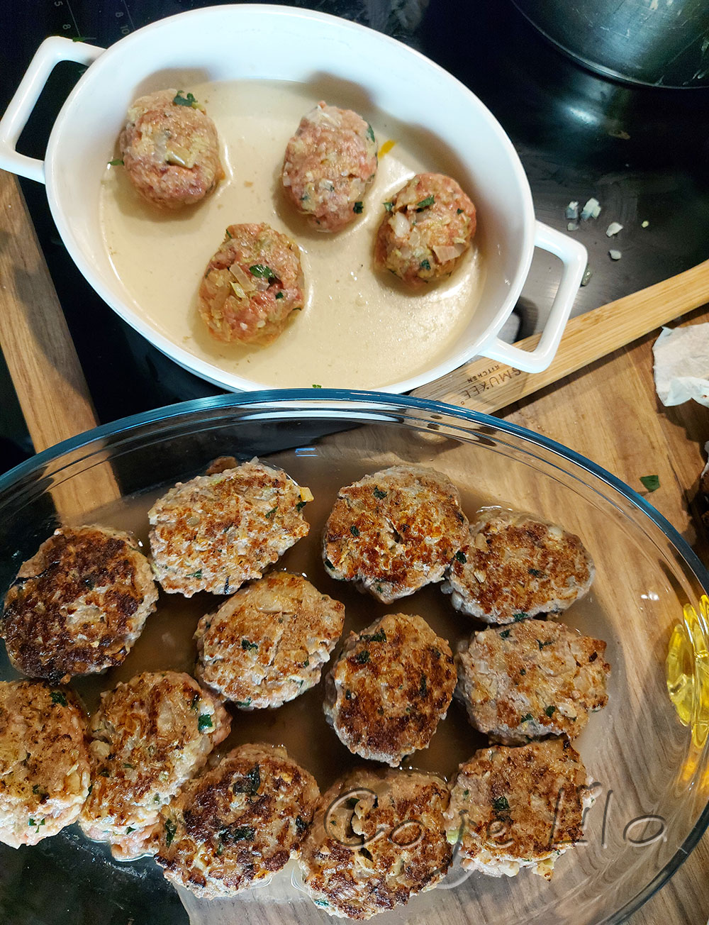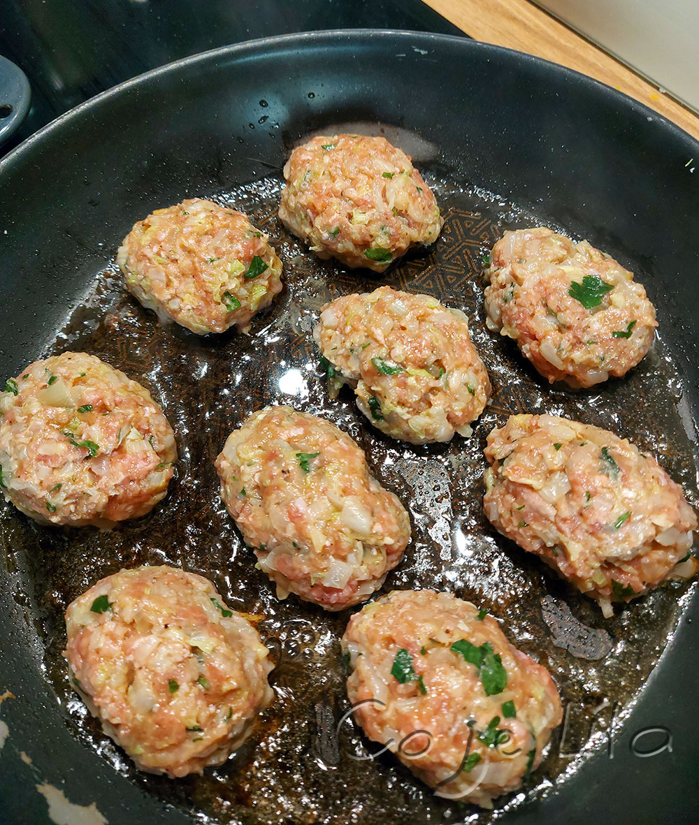 Cebulę drobno kroimy i podsmażamy na oleju. Dodajemy drobno pokrojoną kapustę pekińską i dusimy aż kapusta zmięknie i pozbędziemy się wody. Mieszamy mięso, kapustę z cebulą, przeciśnięty przez praskę czosnek, pokrojoną pietruszkę, przyprawy i formujemy kotleciki. Zrobiłam 4 dla Lilii i odłożyłam na bok. Do naszych dodałam sól i chwilę podsmażyłam na oleju z dwóch stron. Nakładamy do naczynia żaroodpornego, zalewam szklanką rosołu i piekę 190 st. 30 minut. Po 15 minutach przekręcam gołąbki. Z przepisu wyszło 15 gołąbków. Podałam z ziemniakami i brokułem polanym masłem czosnkowym.