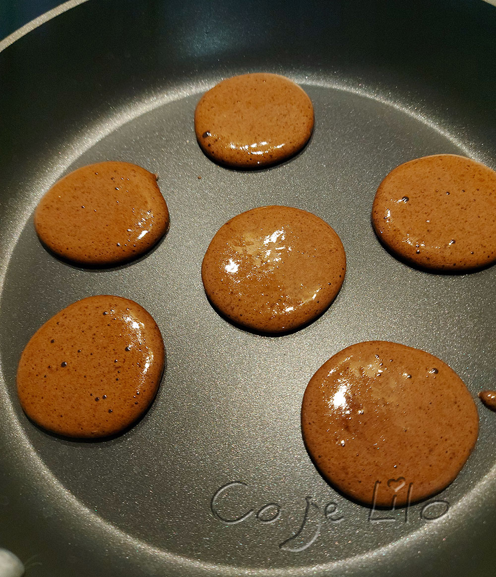 Jajka ubijamy na najwyższych obrotach kilka minut, dodajemy mąkę i kakao i delikatnie mieszamy. Smażymy małe placuszki (po 9 na jeden deser powinno wyjść).