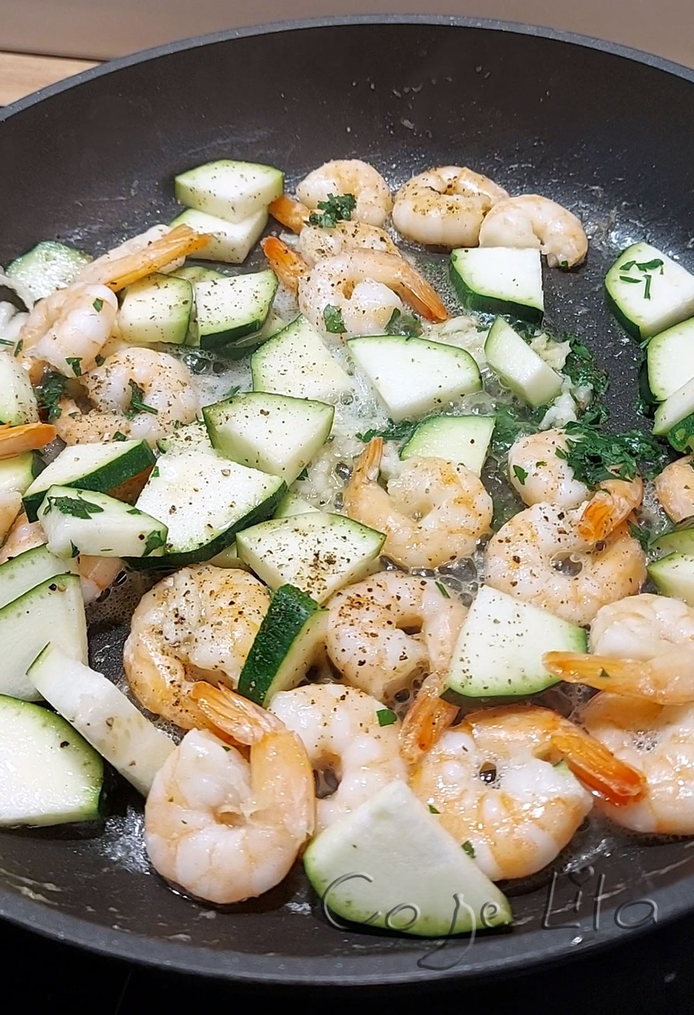 Krewetki jeśli są mrożone to wrzucamy do zimnej wody, osuszamy. Rozpuszczamy łyżkę masła na patelni, wrzucamy krewetki, smażymy ok 2 minut z każdej strony, dorzucamy pokrojoną cukinię, pietruszkę (część zostawiamy), przeciśnięty czosnek, drugą łyżkę masła i chwilę smażymy 😊 Dorzucamy kuskus, zalewamy szklanką wody (1cm ponad kaszę). Dusimy aż kasza wchłonie wodę ok 8-10 minut. Posypujemy pietruszką.