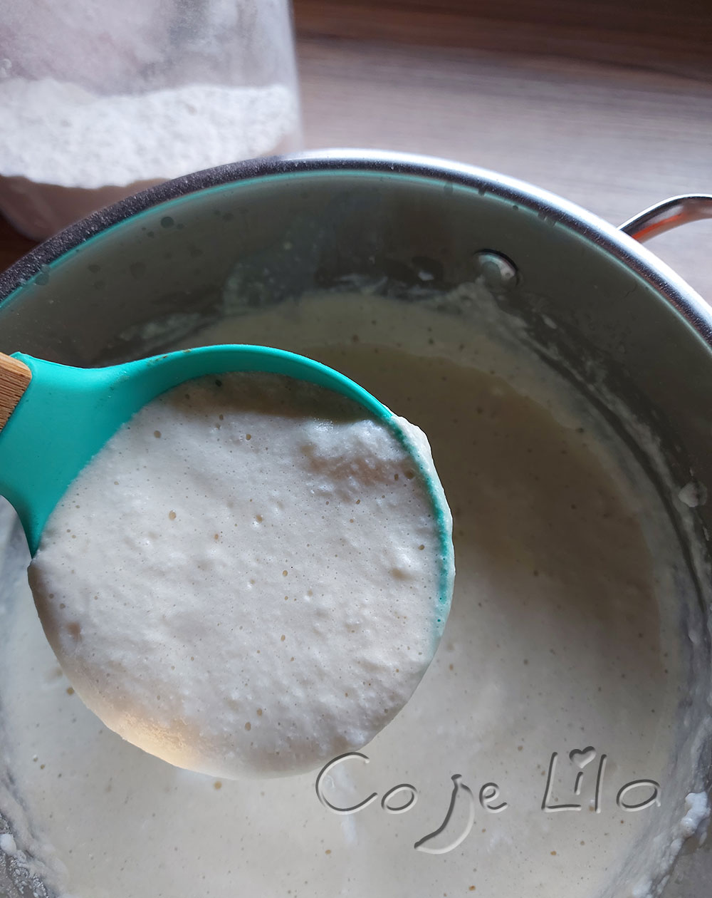 Białka oddzielamy od żółtek i ubijamy na pianę. Miksujemy żółtka z mąką, mlekiem, wodą i rozpuszczonym masłem. Na koniec dodajemy ubite białka delikatnie mieszając.