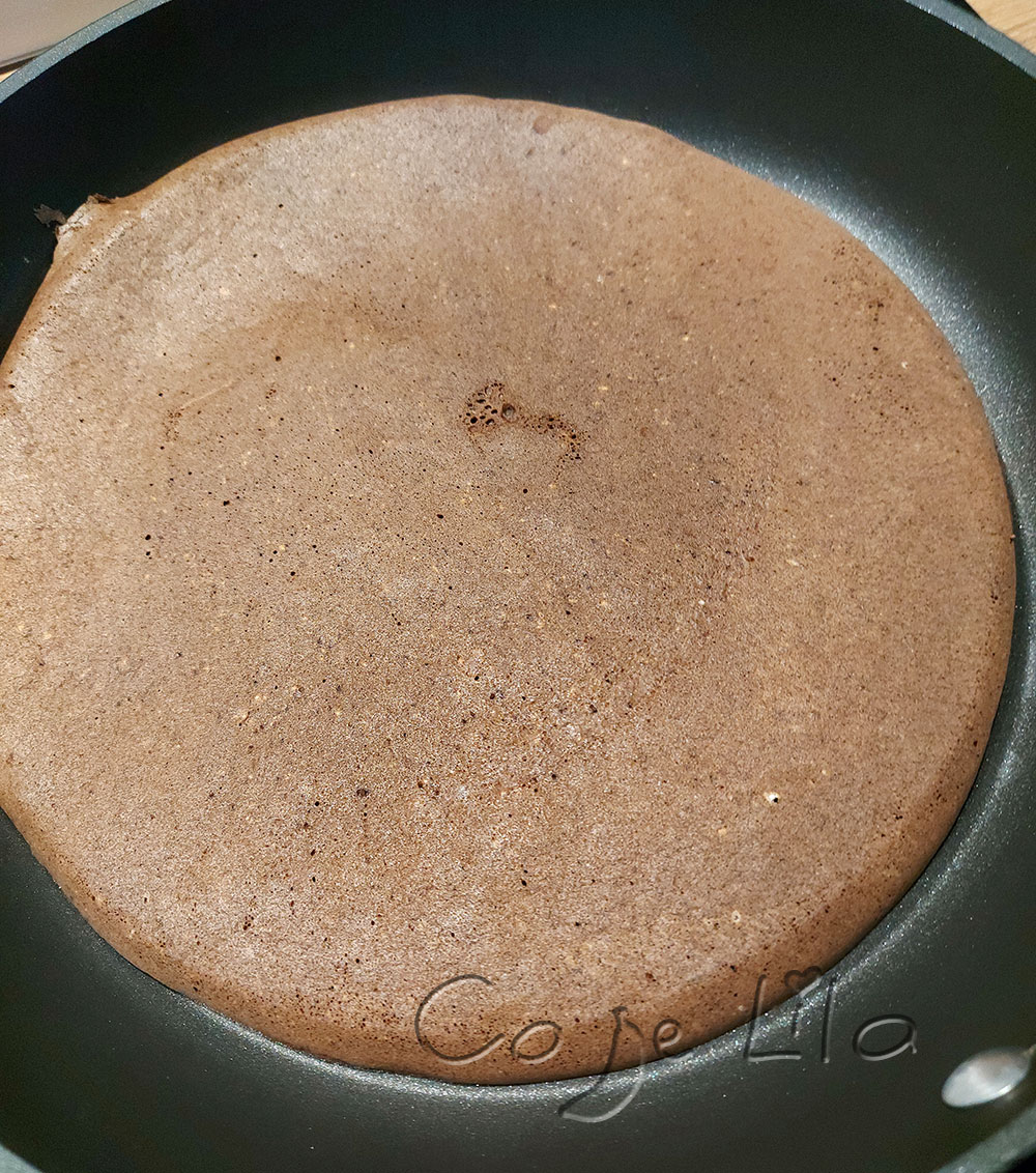 Jajka umieszczamy w naczyniu i miksujemy na najwyższych obrotach 3-4 minuty, dodajemy mąkę i kakao, delikatnie mieszamy łyżką. Smażymy na rozgrzanej patelni na średnim ogniu pod przykryciem. Przewracam rękami oddzielając wcześniej łopatką. Porcja dla mamy i dziecka.