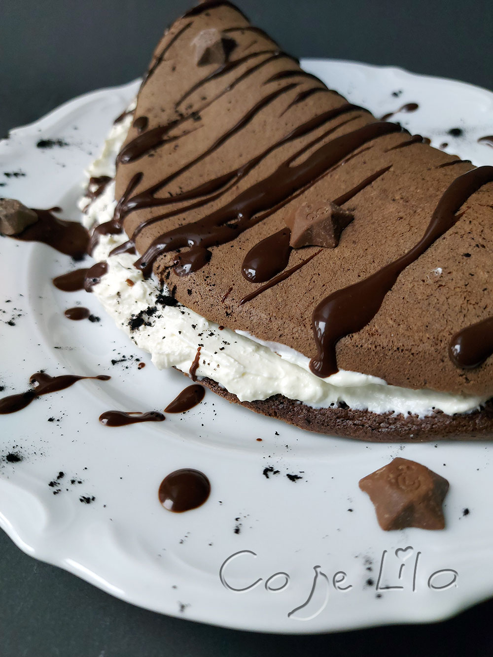 Składniki na krem blenduje. Wykładam na omlet. Jak będziesz jeść w formie omletu bez krojenia to możesz zrobić rzadszy krem dodając więcej śmietanki. Polałam rozpuszczoną gorzką czekolada z mlekiem.