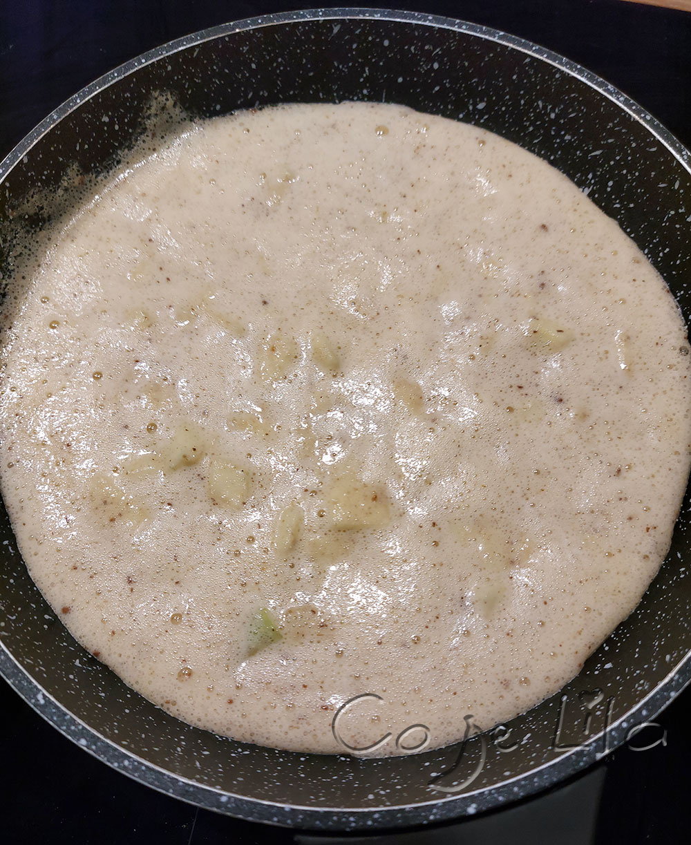 Jajka miksujemy chwilę z olejem, dodajemy mąkę, migdały i pokrojone jabłko, cynamon, pdp. Smażymy bez tłuszczu na średnim ogniu pod przykryciem (około 10 minut z jednej strony, z drugiej 2-3 minuty).