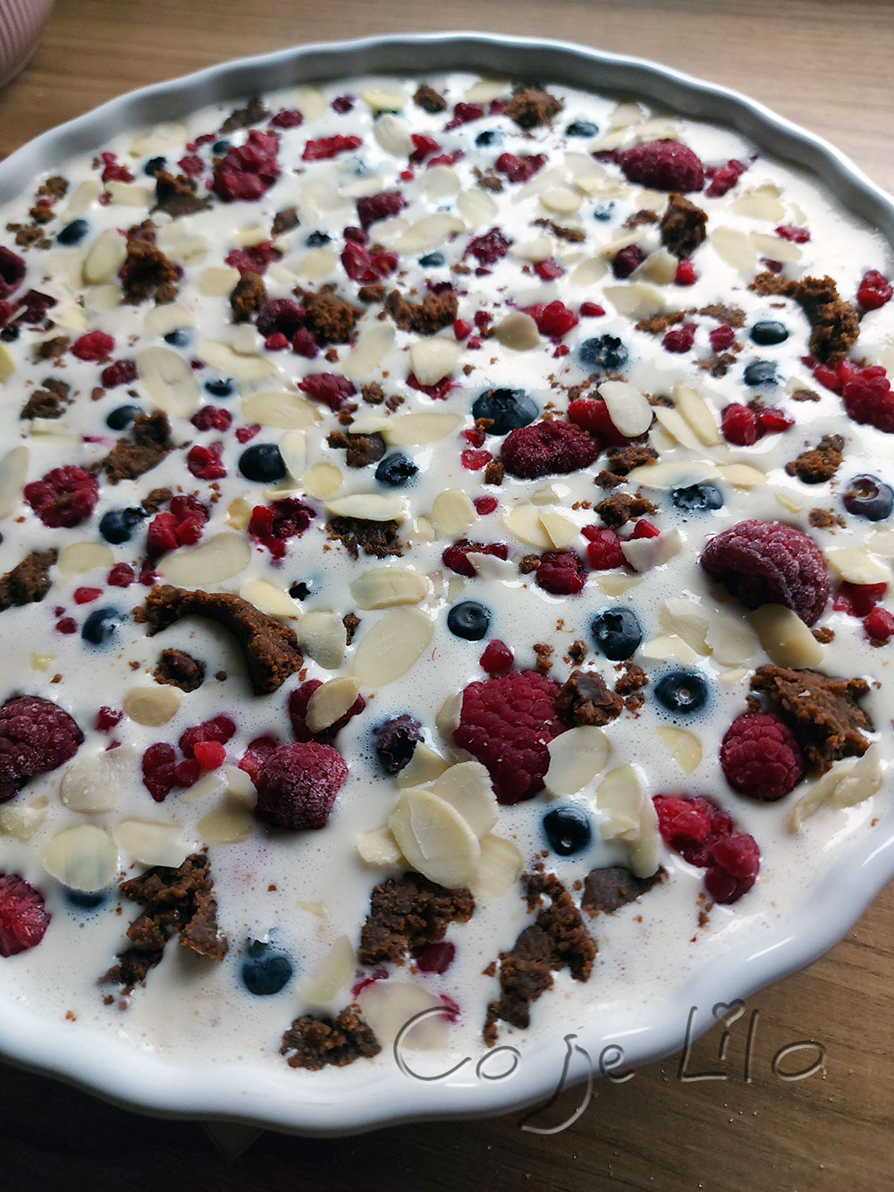 Mieszamy dokładnie wszystkie składniki rózgą lub widelcem. Wykładamy do tortownicy/naczynia do tarty (u mnie 24cm). Układamy na wierzch owoce, u mnie dodatkowo krem czekokrówka 😛 Swoją stronę posypuję erytrolem. Całość posypuje migdałami. Pieczemy 40 min. w 180 stopniach opcja góra-dół (ostatnie 5 minut piekę z termoobiegiem). Chwilę czekamy aż ostygnie. Najlepiej smakuje na ciepło. Podałam z ubitą śmietanką 30%, owocami i zmielonym orzechem włoskim.