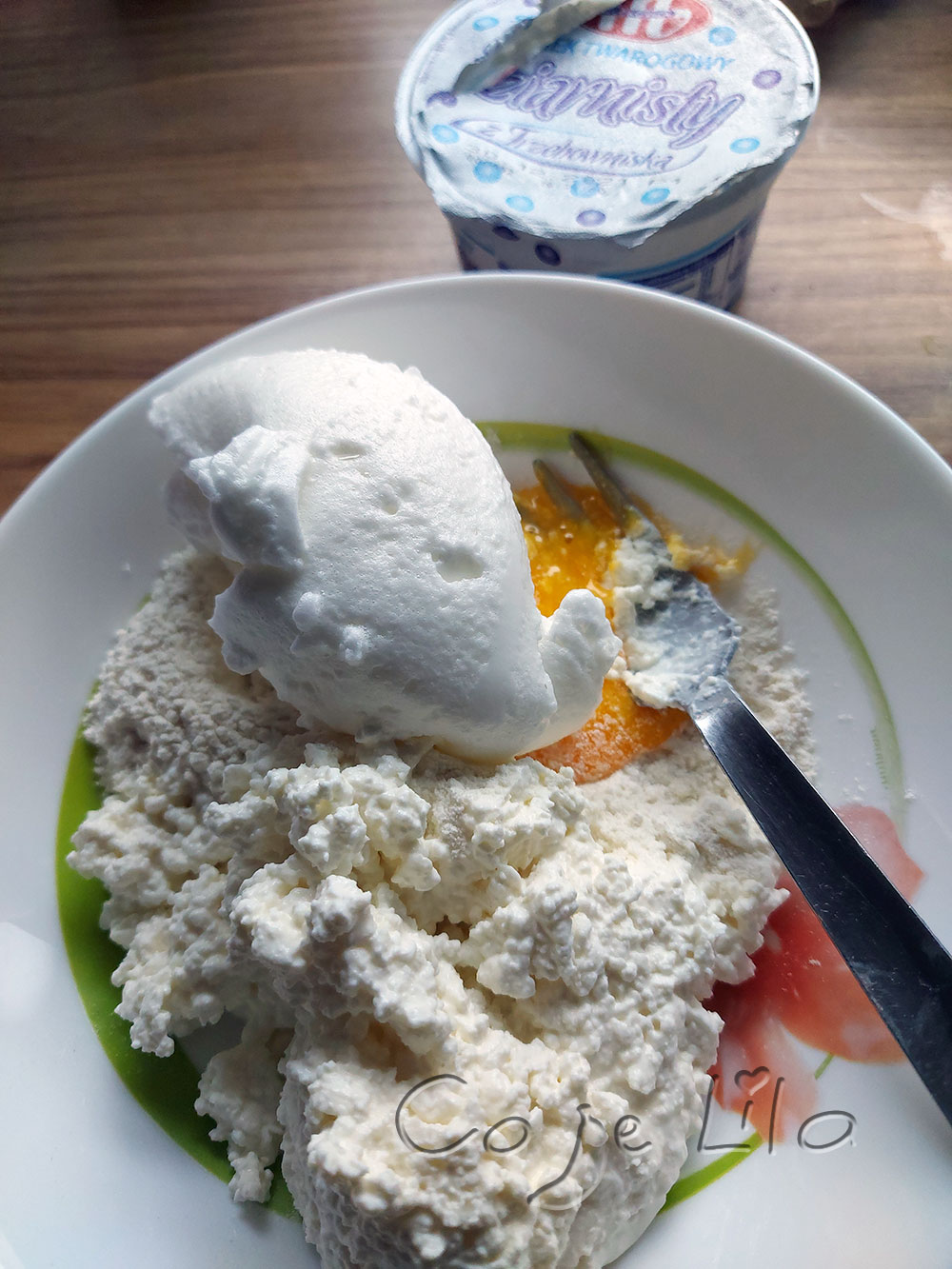 Możesz użyć serka wiejskiego, odlej śmietankę.