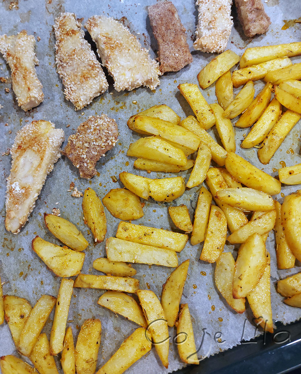 Rybka z frytkami z piekarnika, czyli takie Fish and chips w mojej wersji 😛 Wychodzi pysznie chrupiąca dzięki panierce z sezamem – koniecznie spróbuj 😊