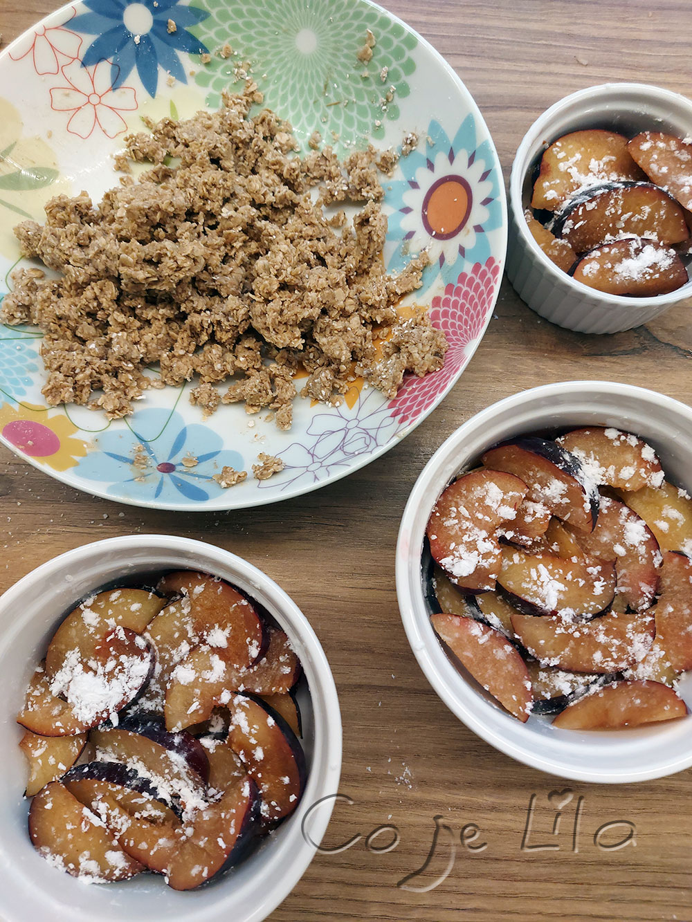 Śliwki kroimy w paski, nakładamy na dół kokilek i oprószamy mąką ziemniaczaną. Nakładamy palcami kruszonkę delikatnie dociskając. Pieczemy 25-30 min w 180 st. góra-dół. Z przepisu wyszła większa porcja dla mamy i taty, mniejsza dla dziecka.