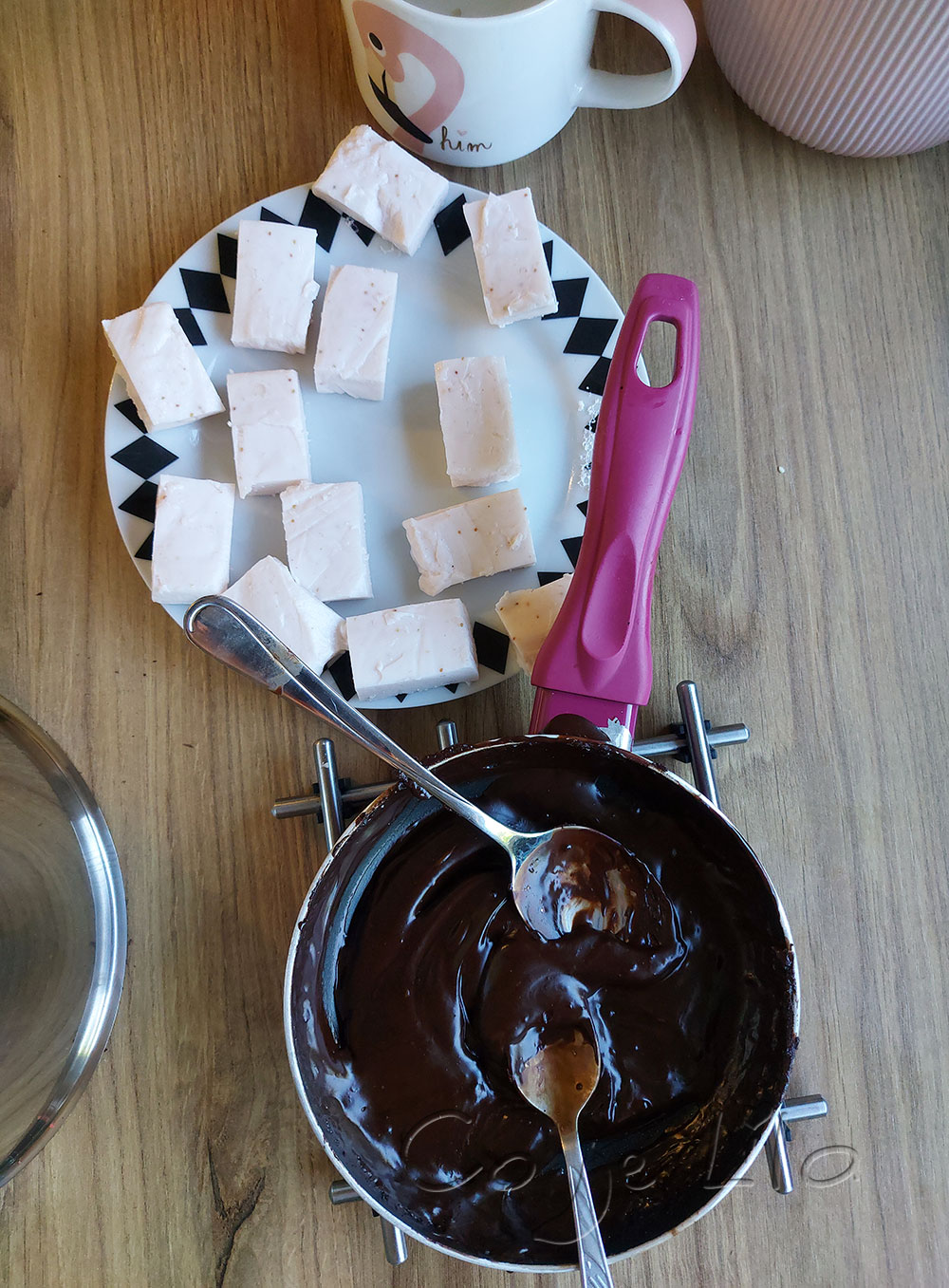 Kefir miksujemy lub blendujemy góra – dół, żeby napowietrzyć ok 3 min, dodajemy pyłek i przestudzoną żelatynę. Przelewamy do keksówki wyłożonej folią spożywczą i chłodzimy kilka h/całą noc. Wyjmujemy, kroimy w prostokąty i polewamy rozpuszczoną czekoladą. Na 1 kostkę czekolady daję 1 łyżkę mleka i rozpuszczam na małym ogniu😉