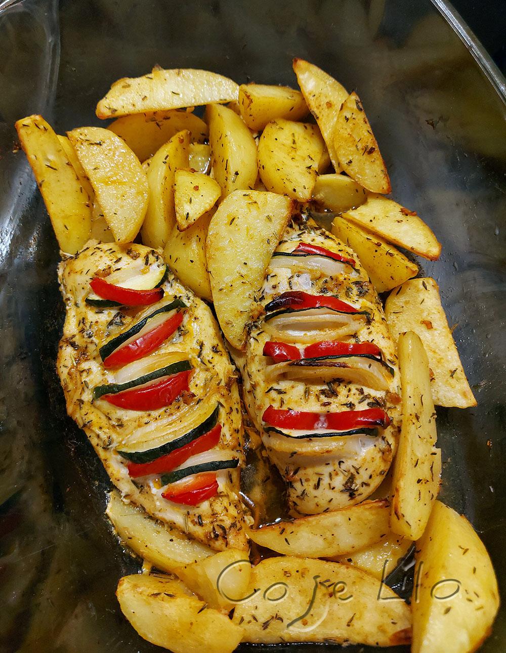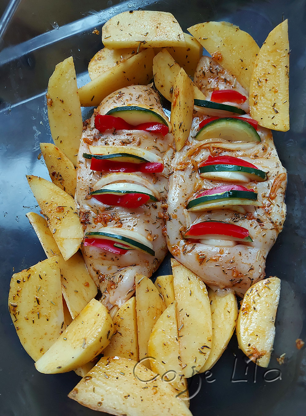 Do miski nalewamy olej, dodajemy przeciśnięty przez praskę czosnek i przyprawy. Nacieramy ziemniaki oraz piersi pamiętając o nacięciach. Wkładamy do środka ser żółty, a następnie pokrojone w paski cukinię, paprykę i cebulę. Nagrzewamy piekarnik do 190 stopni. Układamy w naczyniu na środku piersi z kurczaka, a dookoła ziemniaki. Pieczemy 20 minut pod przykryciem. Zdejmujemy i pieczemy jeszcze bez przykrycia 15 minut.